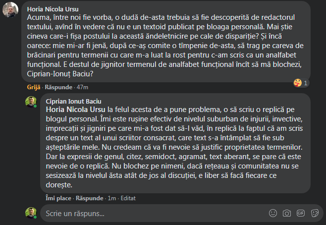 Nu sunt genul de persoană care să-și fi propus vreodată să confere observațiilor critice nuanțe estetice; mă bucur atunci când acest lucru îmi reușește. Dacă, însă, nu se întâmplă, nu voi sacrifica corpul propriu-zis al mesajului în favoarea calofiliei critice. De aici, însă, până la asocieri de genul celor prezente în capturile de ecran de mai sus (semidoct, idioțenii, text aberant, analfabetism funcțional etc.) cred că este o cale foarte lungă. În niciunul din materialele mele cu caracter critic nu m-am referit în astfel de termeni la vreun text sau autor. Nici în polemici, purtate online sau fizic. Respectul pe care l-am oferit, aprioric și necondiționat, oricărui autor de carte românească ar fi trebuit, în opinia mea naivă, să se întoarcă în aceeași măsură. Cu atât mai mult cu cât nu sunt de ieri de azi în fandomul românesc. Îmi amintesc chiar despre recenzia domnului Michael Haulică la textul meu de debut; nu a fost una favorabilă. Dimpotrivă. Însă în ruptul capului nu mi-aș fi permis să îl iau la rost, să îl iau peste picior, să îl ironizez pentru opiniile domniei sale sau, mai rău, să asist impasibil la un linșaj de genul celui petrecut în spațiul său online.